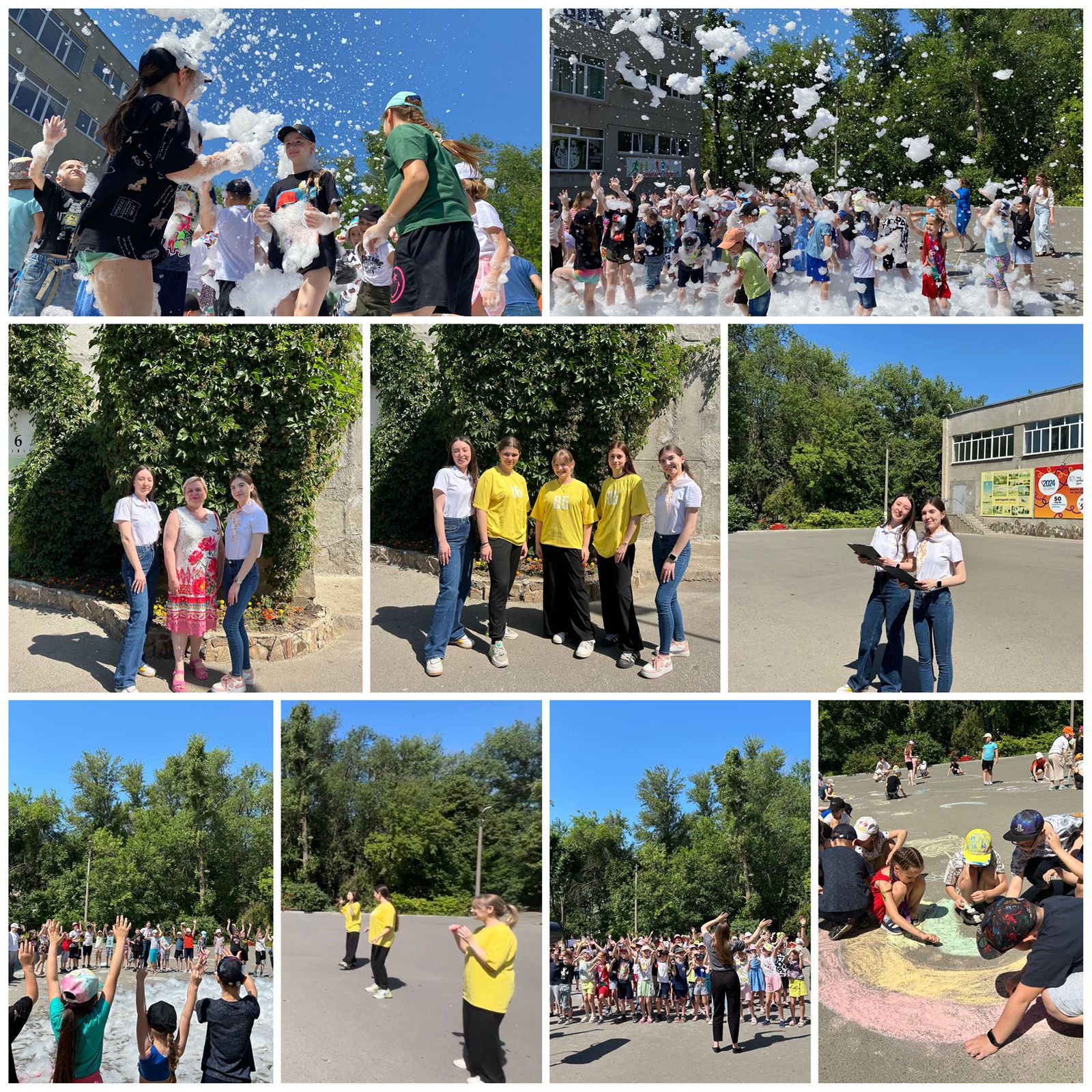 На школьной площади состоялся настоящий Фестиваль детства! Ребята танцевали, играли в игры, рисовали на асфальте и даже приняли участие в пенной дискотеке!